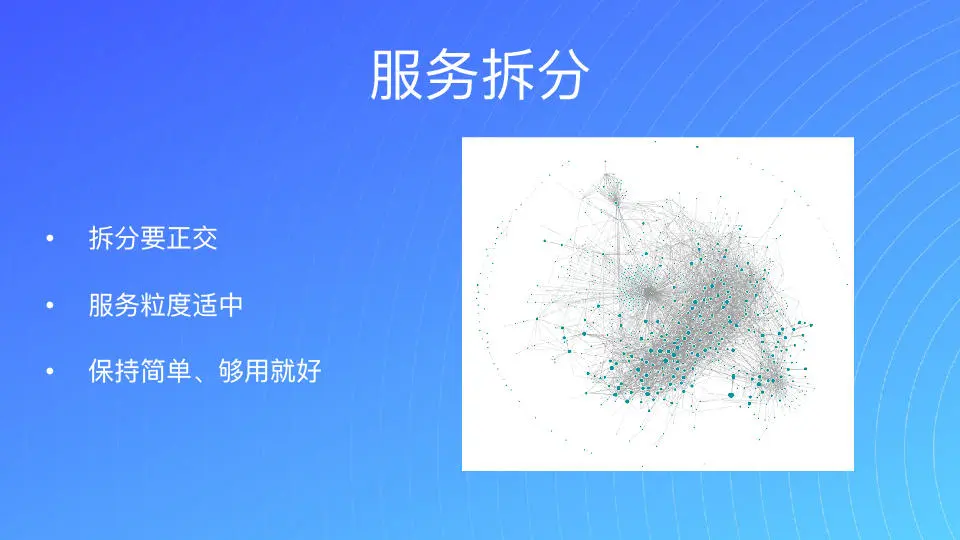 我们在拆分服务的时候,一定要注意治理,为保证服务质量,一定要让服务拆分得比较正交。我们也不要把服务拆得过细,这是治理非常核心的部分。我始终强调,我们在服务架构选型和治理的各方面,应该保持它足够简单。一般情况下,这种方式能够用就要保持克制,够用就可以了,有一定的前瞻性是没错,但是不要太过于超前。