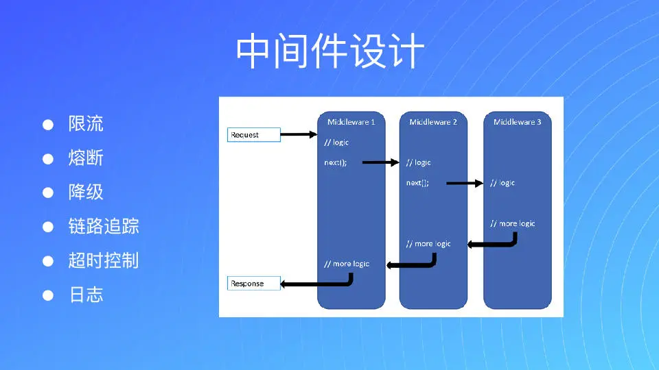 所以对我们来讲,把很多微服务能力都集成在中间件上,比如说限流、熔断、降级、链路跟踪,超时控制、日志等等,我们全是用中间件的方式来给大家实现。图中是一个典型的洋葱模型,一层一层进来然后再出去。
