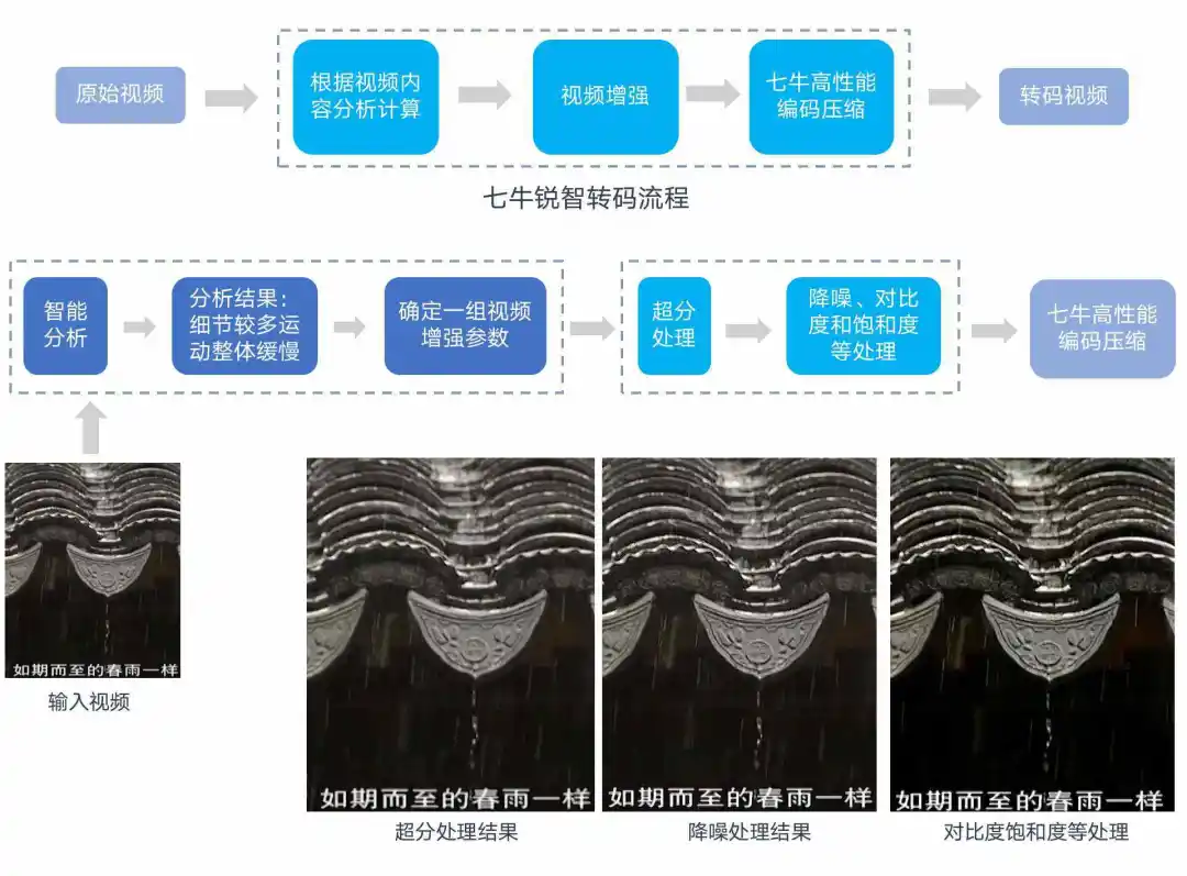 七牛云锐智转码,提供可以兼得的答案。锐智转码能够根据视频内容进行分析,智能识别场景特性,动态调整图像增强算法,得到对应的视频增强参数,从而使得增强效果更好。与此同时,增强效果会衡量质量和码率,最后得到码率更低、画面更清晰的转码视频。