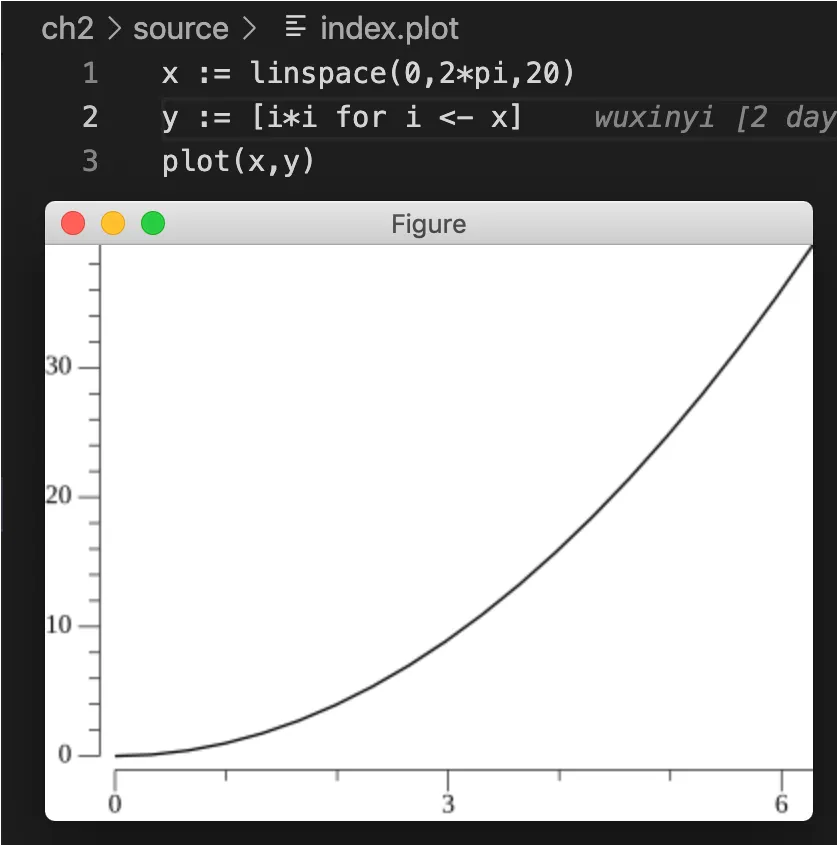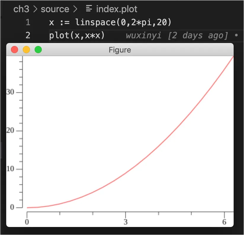linspace 是 Matlab 的一个语句,我们这里实际上是仿照 Matlab 实现 ClassFile 内部的函数。然后通过 Go+ 的 for 循环进行 y 的 x 平方计算,最终通过 plot 函数输出函数曲线。