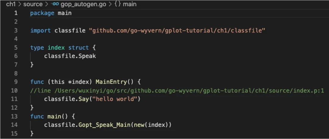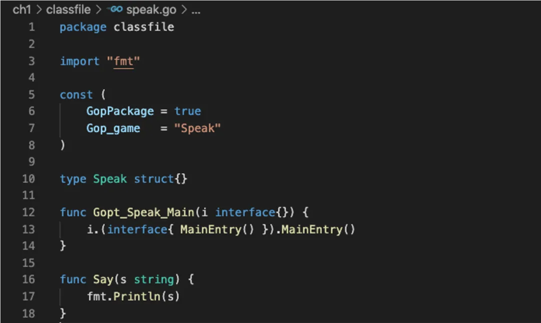 上图便是为 say(“hello world”)代码所设计的 ClassFile。其中定义的 Gopt_Speak_Main 便是该 ClassFile 的入口,会在该函数中调用MainEntry 方法,来执行我们的 DSL 代码。最后在 MainEntry 中调用 say 函数,通过 fmt.Println 实现标准输出。