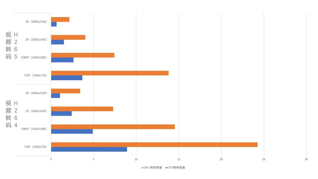 GPU 转码的特性,用一个字来概括,就是「快」。尽管在视频的压缩性能和相关转码功能上,相比 CPU 软件转码有所损失,但是由于其使用专门电路进行计算,从而获得了更快的编解码速度,在编码上体现得尤为明显。通过下图的对比可以看出,在输入输出不改变分辨率的情况下,GPU 转码的速度比 CPU 转码要快 2 至 3 倍。这意味着 1 分钟时长的视频,CPU 转码以 1 倍速转码需要 1 分钟左右,而通过 GPU 硬件转码,20 到 30 秒即可完成。