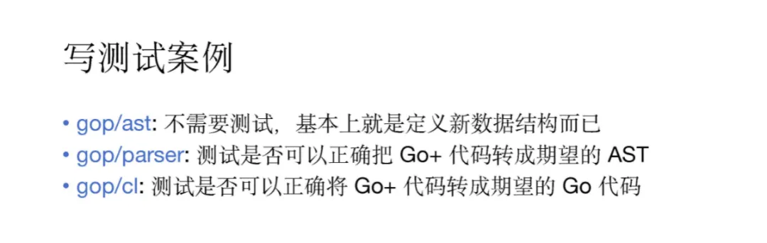 大家可以看到,在具备这些功能和特性后,给 Go+ 增加功能其实是非常容易的。当然我们非常重视工程化,在完成功能后一定要考虑测试案例的问题。