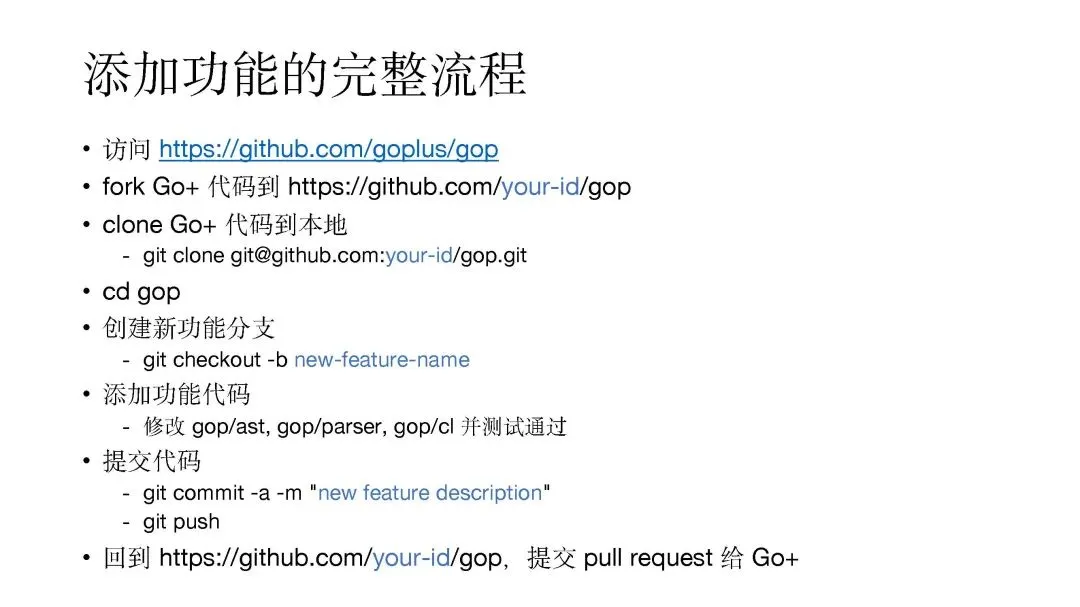 开发的第一步建议大家创建新的功能分支,然后再进行代码的修改并通过测试后,便可以提交代码,提交 pull request 给 Go+。