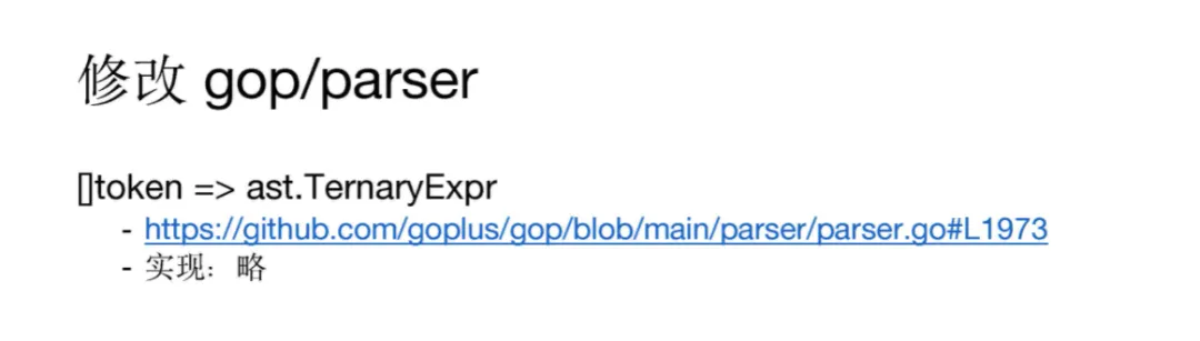 第三部分是修改编译器。修改编译器的第一步不是立刻去改,而是在心中考虑清楚要增加的功能 的 AST 节点转换为 Go 的代码是什么样子的。上图中的蓝色注解便是三目运算符,它最终转换后的结果我做了一个可能的实现方式,是一个对闭包的调用。