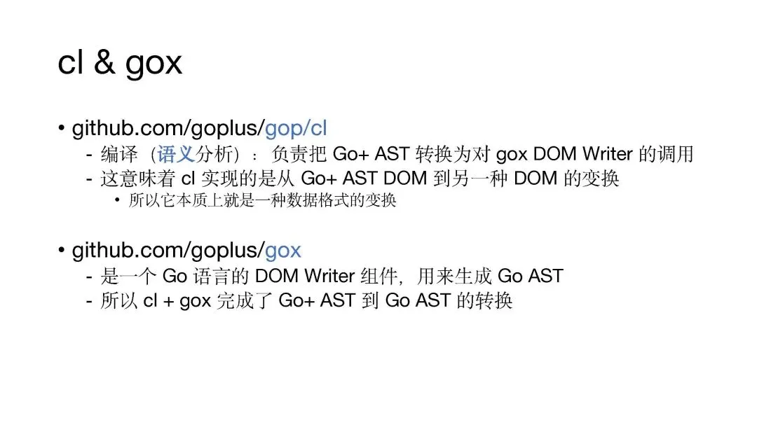 编译器输入的是 Go+ 的抽象语法树,输出的是 Go 的 DOM Writer,而 Go 生成的这个组件其实也是为了生成 Go 的抽象语法树。因此我们可以看到,cl + gox 的结果是把 Go+ AST 转化为 Go AST,本质上实现了数据格式的变换。
