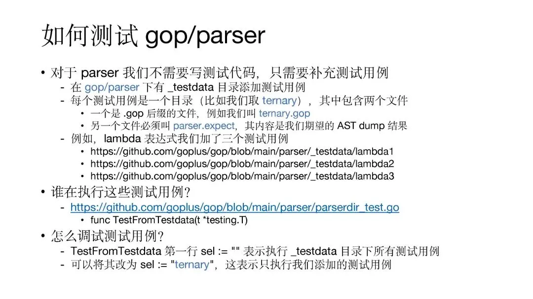 首先我们来看如何测试 parser 模块。对于语法分析,实际上我们基本不用写测试代码,在我们准备好的测试框架中补充测试用例即可,我觉得这是 Go+ 在生产力优化方面做得比较好好的一个点。