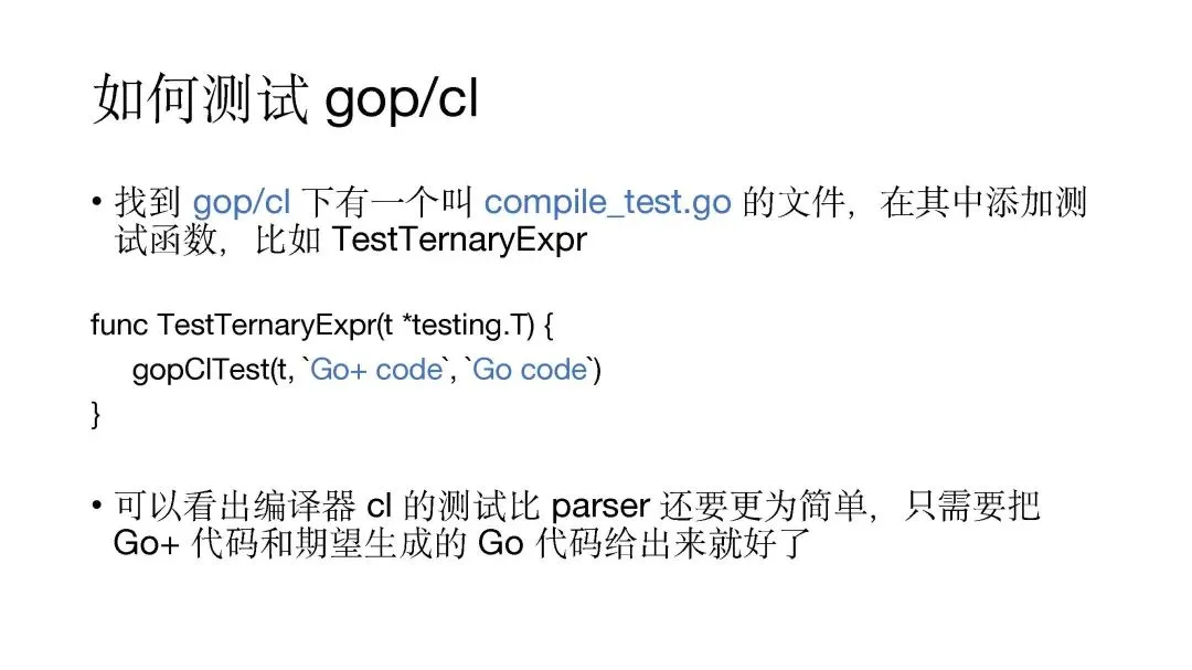 大家基本上只需要在编译器的目录下找到 compile_test.go 文件,在里面增加一个测试的函数,如 TestTernaryExpr。这个函数的代码也非常简单,调用 gopClTest 函数,给出你希望 Go+ 的代码和期望生成的 Go 的代码就 OK 了。