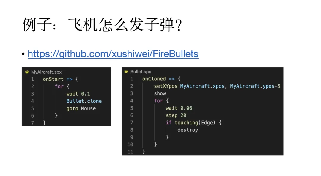 3. 如果用户发生交互(比如按了键盘,用鼠标点击了舞台或者精灵)- 执行对应的 onKey、onClick 事件的代码我们举个相对复杂的例子: 工程地址:https://github.com/xushiwei/FireBullets
