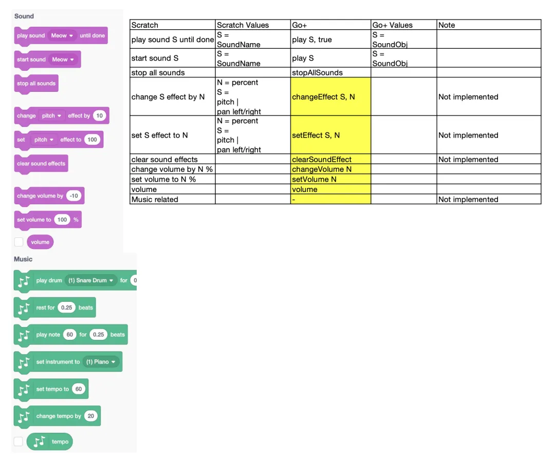 Sound 部分的类型主要包含声音的播放、声音的特效、音量以及一些乐器类功能。这部分 Go+ Spx 的完成度相对较低,主要就实现了用得比较多的声音播放相关的功能。 声音特效,乐器类、音量调节都相对较少会被使用。音量调节更不用说,可以靠系统自带的音量控制来实现。