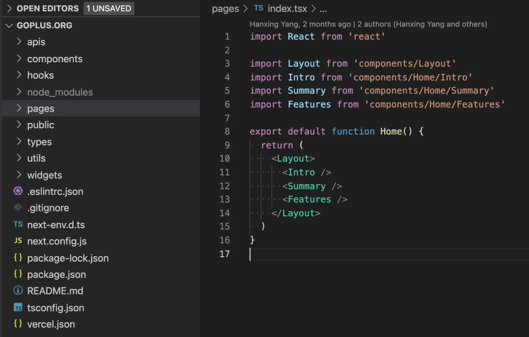 官网的页面如上图所示,主要承载的内容用于帮助初学者了解Go+整体的定位,并提供了一个Try Go+模块可以用于直接编辑、运行Go+的示例代码,提供最直接的使用感受。上图为goplus.org代码的目录结构,大家可以发现这是一个非常典型的前端项目。基于Next.js框架,使用React进行组件的构建,从而实现页面功能。goplus.org的部署比Tutorial要相对复杂一些。