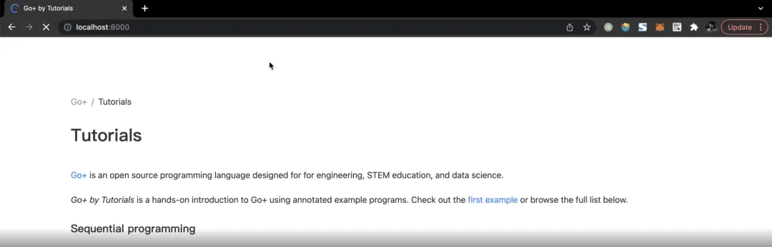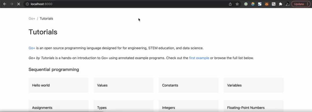 上图为Tutorial的简单部署流程图。当Master代码被更新时,会有一个自动化的部署工具,拉取Tutorial最新的代码,对其中的Go server进行编译,并将其中的模板与编译完的二进制文件一起上传到服务器中。用户在请求服务器时,Go server会根据用户请求的request获取到对应的代码示例文件,转换成上述页面的形式。Tutorial站点的一个特性是,其的内容具有非常强的共建性质。目前Tutorial当中很多章节的内容是缺失或不完善的,希望大家可以一同参与共建,共同完善Go+Tutorial。