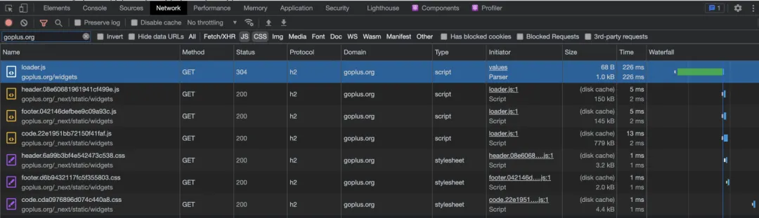 上图展示了Tutorial站点加载widget过程中对应的请求。首先浏览器会加载一个loader文件,这个loader文件非常小,只有68B,是一个304请求,表示内容没有发生变化。loader文件对应的请求每次都会被发出,以保证总是能请求到最新的loader。而后续的header、footer、code这些widget对应的文件几乎总是可以走缓存,在图中显示为disk cache,也就是磁盘缓存。