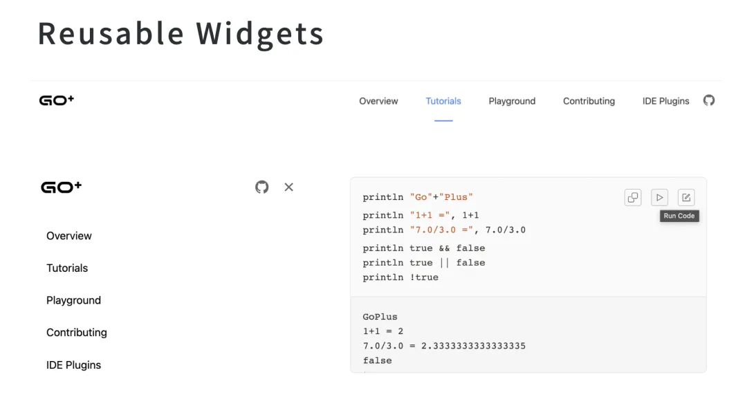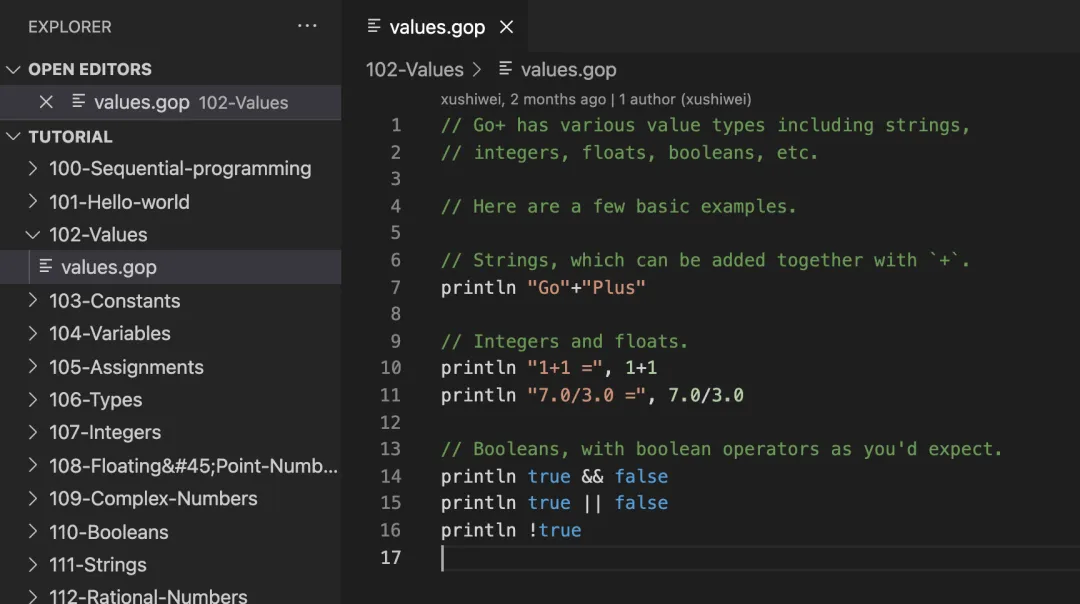 Tutorial的主要代码组成相对比较简单,主要包含各种示例代码,以章节为目录进行顺序排列,每个目录中包含一个或多个Go+的代码文件;在这些代码文件中,包含一个或多个代码片段,每个代码片段可能会包含对应的注释以及文档说明。此外项目中还包含一个基于Go开发的server负责对内容进行解析,渲染成在Tutorial页面中的代码形式。上图中左侧的values.gop文件,通过server渲染后的展现形式即为下图: