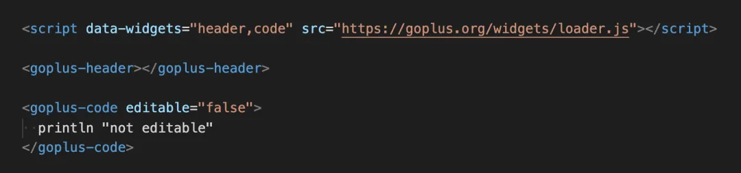 左侧的是在Medium中嵌入一个GitHub的代码片段,右上角的例子是在第三方站点中嵌入一条Twitter推文,右下角则为在任一站点中嵌入一段Youtube视频。如果我们想将中Go+的代码编辑模块嵌入到某个第三方站点或某人的博客中,面临的问题是如何在各种不同技术栈的项目中,进行界面或者功能的复用。此前提到,goplus.org本身是基于Next.js(React)+Typescript的项目;Tutorial的页面主体则是由基于Golang实现的HTTP服务进行渲染,页面的动态逻辑则是通过非常简单的JavaScript进行点缀。除了goplus.org以及Tutorial,考虑更多的复用场景,涉及到的技术栈会更加复杂、更加多样。除了需要跨不同的技术方案外,还有一个挑战是要在所有的复用场景中保持最新的行为——Deploy once,up to date everywhere.比如我们对现有的代码块(code)组件进行了某个优化,希望在重新发布后嵌入这个组件的第三方站点不需要进行任何操作,就能够自动升级,各站点的用户都可以直接使用到最新的组件功能。这是我们在做复用时希望能够达到的一个状态。基于这些前提,我们最后设计了一个我们称之为Widgets的方案。