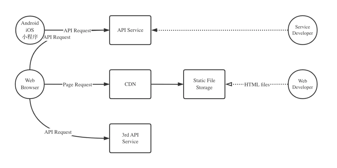 首先,应用本身是静态存储、通过CDN进行分发的,当访问量变大时,可以以非常低成本的方式来进行扩展,因为CDN还有对象存储这类的基础设施天然便具备应付海量访问的能力。此外站点或应用本身被生成为静态文件,非常适合被下发并缓存到CDN节点中,从而可以给用户更快的访问速度。对Web应用开发者来说,相比去维护一个一直运行着的服务器,基于Jamstack的应用部署也会更简单。部署一个自身包含server的Web应用,意味着要把构建完的server二进制文件进行替换,并重启服务;而对于Jamstack方式,部署时做的事情就是简单的文件上传,因此无论是复杂度还是操作的风险都会小很多。还有很重要的一点,用Jamstack的方式搭建Web应用,是把Web视作一般的端体现。在传统的Web应用开发过程中,我们会采取跟其他的端非常不一样的开发部署方式;常规的Web应用会有自己的web server、有特别的鉴权逻辑、以及自己的一套API访问方式。而如果我们将此前展示的Jamstack部署逻辑进行扩展,可以得到如下的图:从图中可以看到,中间的流程线对应的是Web Developer,搭建好Web应用后直接上传到静态文件存储服务,然后通过CDN进行下发,用户通过浏览器请求到的即为应用本身。应用会运行在用户的浏览器中,请求基于HTTP的API服务,甚至去请求一些第三方的API服务。不难发现,在Jamstack的方式下,Web浏览器中的应用和Android、iOS、小程序中的应用是对等的地位,都是通过静态存储以及CDN进行应用的分发,可以依赖相同的API Service(并走相同的API gateway)来实现动态功能。通过这个视角来开发Web应用或组织开发人员时,会发现Web是一个最普通的端,我们往往不需要单独去开发一个web server,对应的,也不再需要既有服务端开发和运维经验、又了解前端业务的人来进行维护。