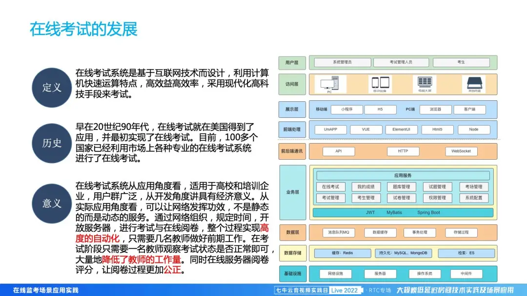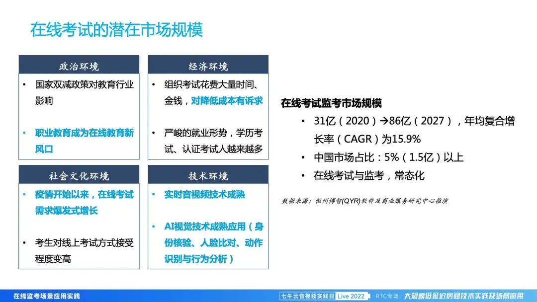 从几个方面来讲。首先是政策环境,自去年开始,国家对教育行业进行政策上的影响,所以目前职业教育会成为在线考试的新风口。第二个是经济层面,从宏观上来讲,因为在线监考可以有效降低成本,能够让整个社会运转成本下降。然后从文化环境来讲,疫情后的在线考试、在线办公都得到了极大的普及和爆发式增长,考生和组织方对线上考试的接受度也是有非常大的提高。最关键的一点,是整个技术环境有了质的发展,基于 5G 和 RTC 技术的成熟,使在线监考、在线考试的稳定性和监考的公平性,都得到非常大的提升。通过 AI 的引入,可以使整个监考过程中的舞弊行为被更好地甄别。