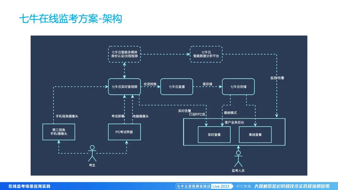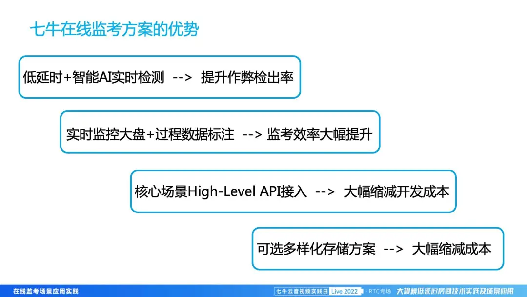 接下来会为大家介绍我们方案的优势,主要有四个方面。第一是通过我们七牛云 RTC 的低延时和 AI 能力的结合,提升整个作弊的检出率,确保整个考试的公平、公正。第二个是通过我们实时大盘和过程数据的标注,可以有目的、有选择地进行实时监考,让老师的效率得到大幅提升。第三是通过 High-level SDK 的接入,可以帮助我们的客户大幅缩减开发成本,让产品快速上线,服务更多的客户。第四是因为我们的存储可以进行多样化选择,用户可以使用七牛云的云存储,如果用户有自建存储,也可以把对应的视频,放到自建存储里来缩减成本。