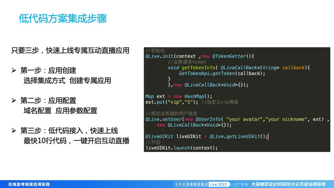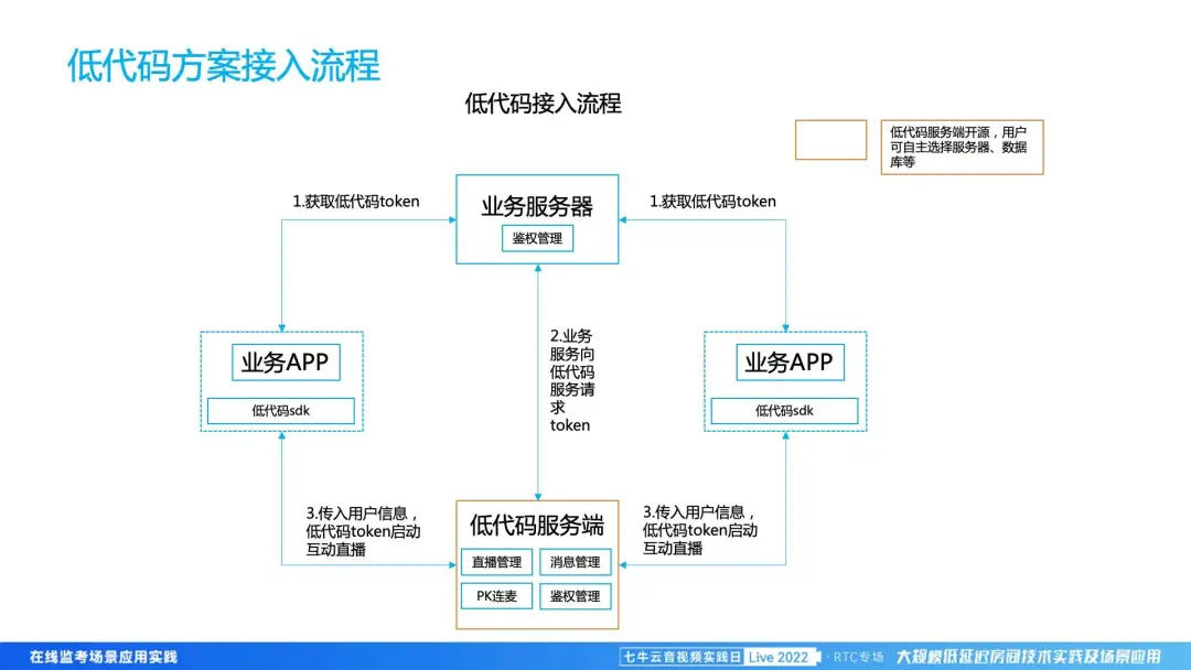 在低代码方案中,我们帮用户做的事情会比之前更多。我们不仅会帮用户画 UI、实现交互,也会提供用户的业务服务端,包括互动直播、PK、禁言、举手等操作。用户可以在我们的低代码服务器申请低代码的 token,然后把我们的低代码嵌入到他的自己的业务应用里面,然后访问整个低代码的服务器,其中会有各种业务组件,理论上就不太需要开发代码。目前这一块低代码服务端我们是开源的,所以用户可以部署在自己的服务器上。