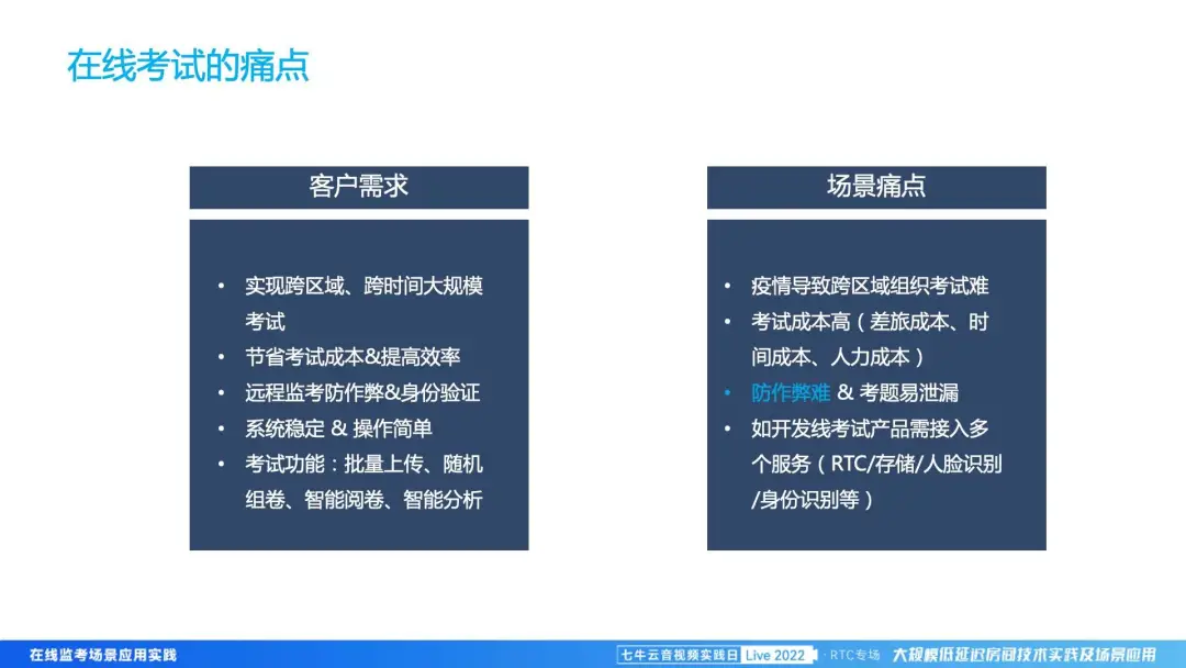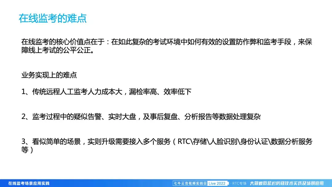 其实大家可以想一下,如果我在一台电脑上进行考试,会的题目就直接做掉了,如果不会,那这个时候怎么办?最简单的,可能拿着题目去网上搜索一下,然后可能立马就有答案,或者刚好我不会,我旁边请了个比较厉害的人,他跟我讲然后我来做。那这样的话,会严重影响整个考试的公平、公正,也会严重影响整个行业的发展。所以我们在线监考,其实是重点着眼于怎么确保整个考试的公平、公正。基于这样的情况,业务实现上的难点主要是远程人工监考下,漏检率要得到改善,要在监考过程中,对各种舞弊行为能够及时告警,后续也能进行及时复盘,包括数据、证据的一些落地。最后是在线监考会涉及到非常多的服务,我们帮客户快速把这些服务对接起来,更好地落地。