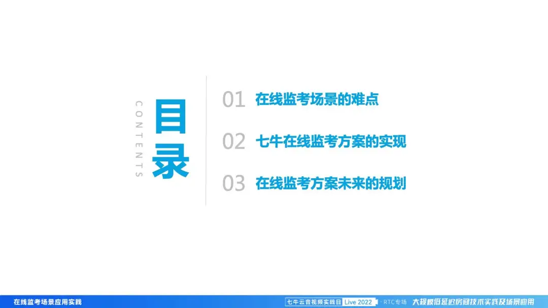 我的分享会从三个部分展开。首先为大家介绍在线监考的起源和背景,阐述在线监考场景的难点。第二部分会重点讲七牛云在线监考方案的实现与打磨。第三部分会给大家带来未来的规划。