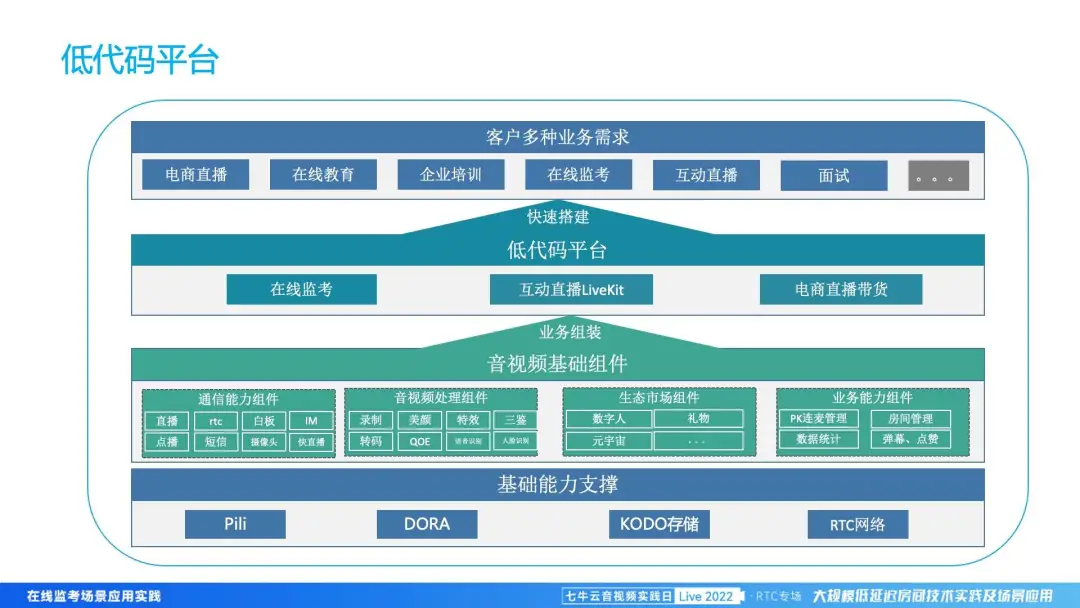 为了更好地服务客户,我们的低代码平台将公用的业务组件进行封装,包括房间、连麦 PK 等具体场景的标准组件,以及服务端的能力和对应的 UI 的页面。那在低代码平台上,会衍生出在线监考、互动直播、电商直播带货等各类产品。客户如果需要对应的场景,就可以一键把服务跑起来。